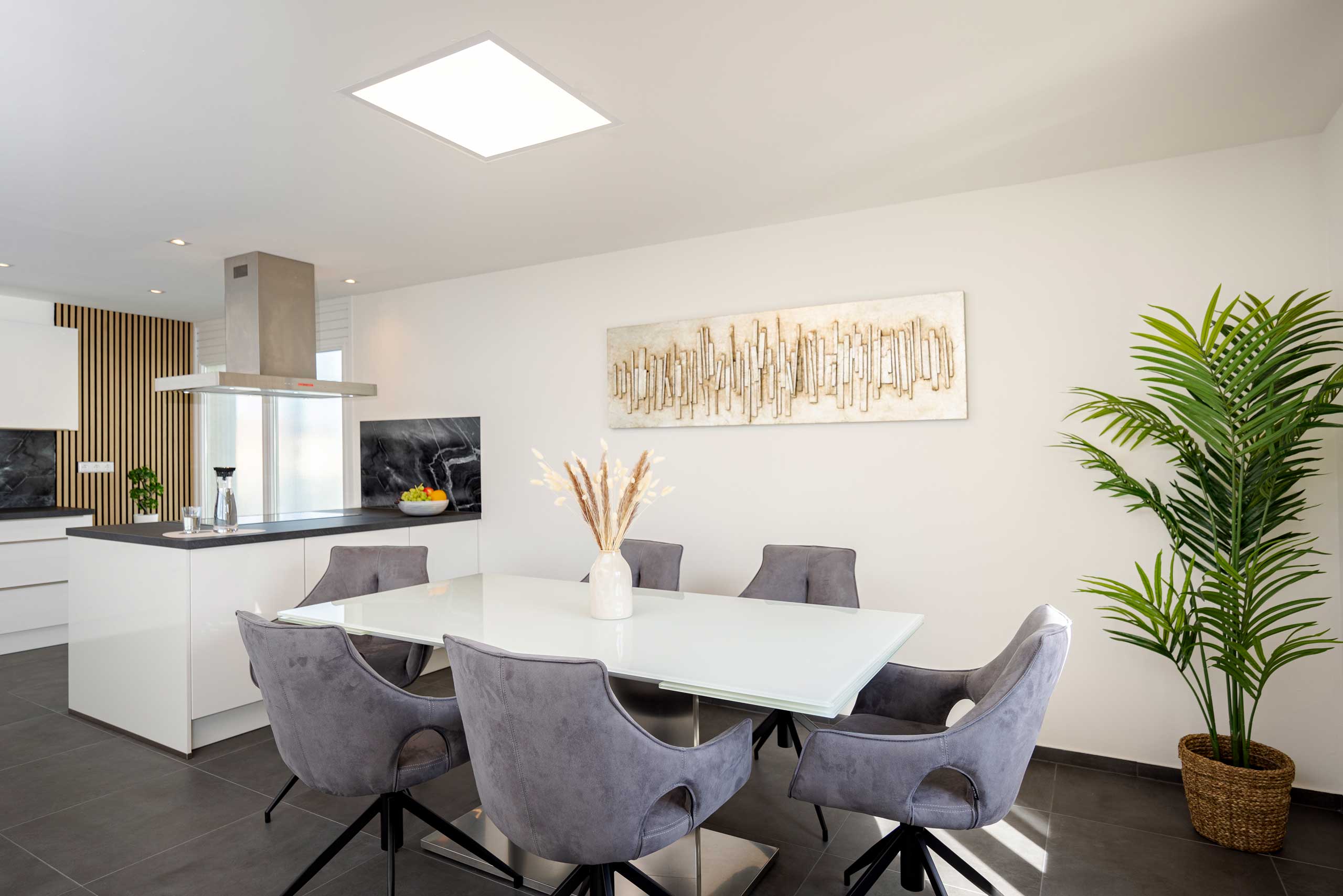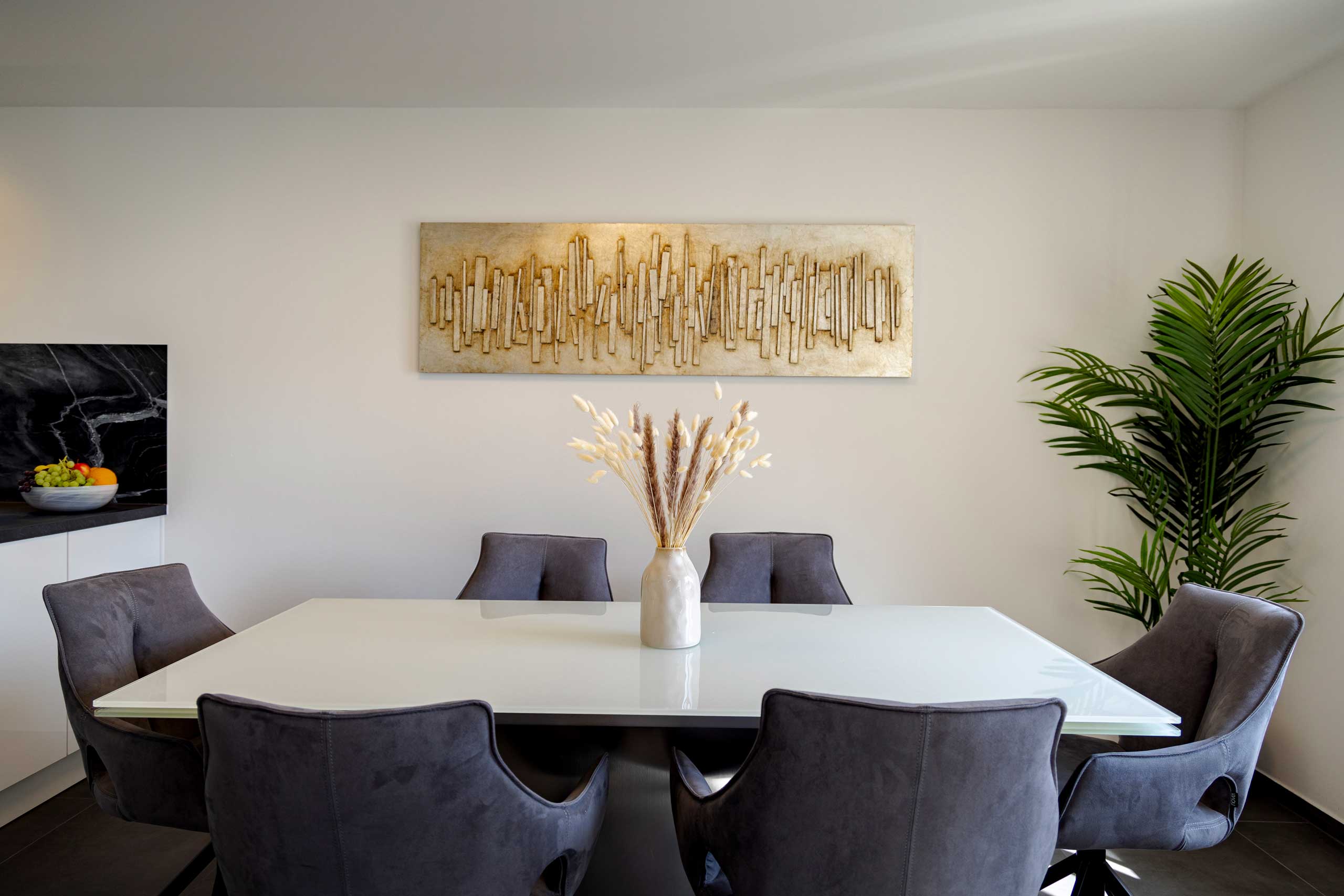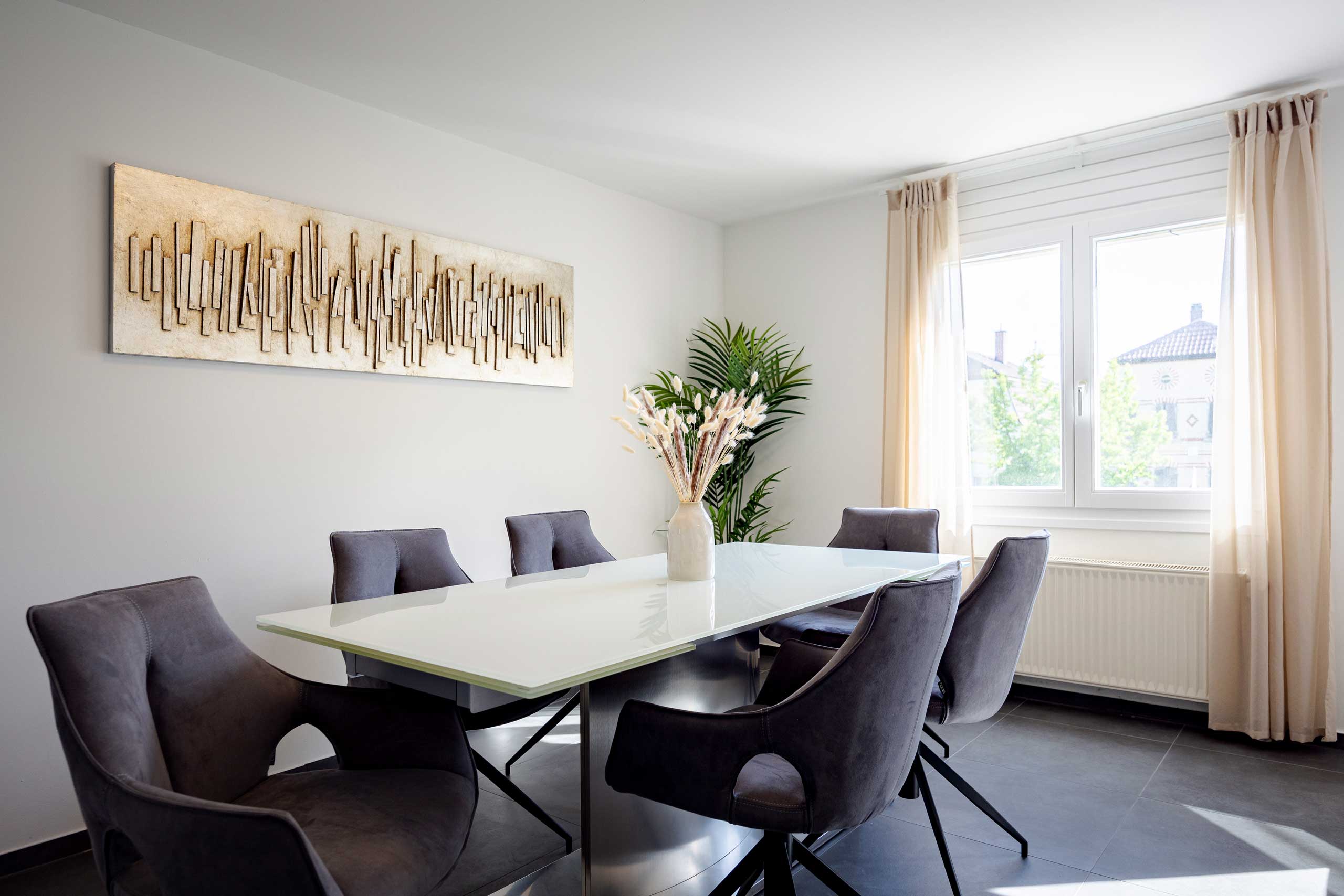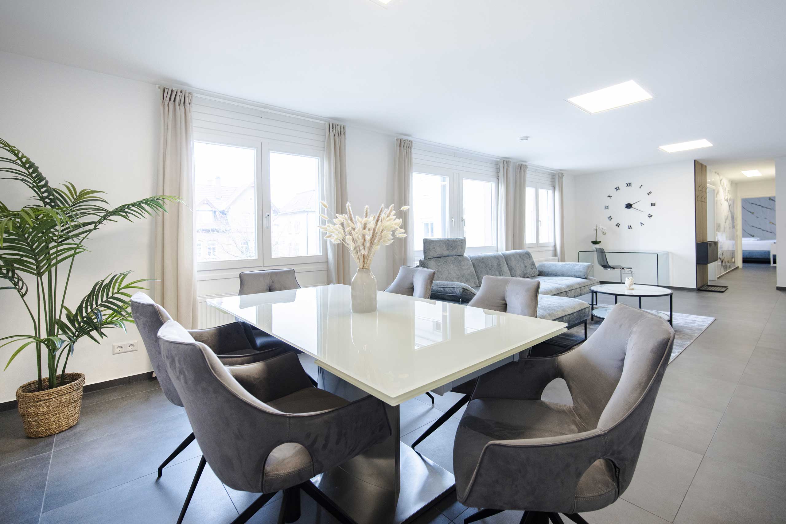 Entdecken Sie unsere hochwertige Ferienwohnung in Kornwestheim. Die Galerie zeigt Ihnen stimmungsvolle Eindrücke von Komfort und durchdachten Details unserer Unterkunft. Der großzügige Essbereich lädt zum Verweilen ein. Gemütliche Schlafzimmer, ein stilvolles Bad und der einladende Außenbereich verbinden Funktionalität mit echtem Wohlfühlambiente.